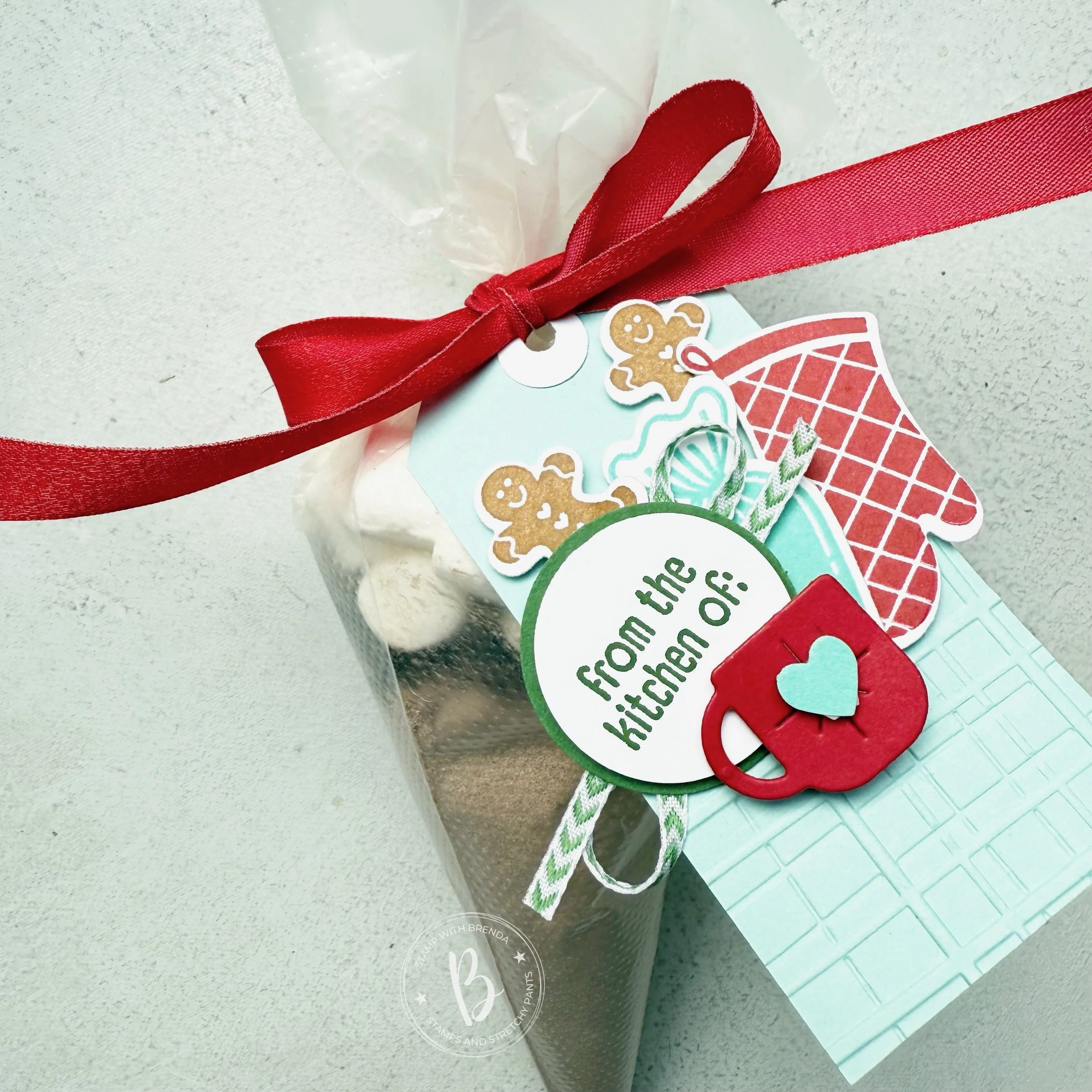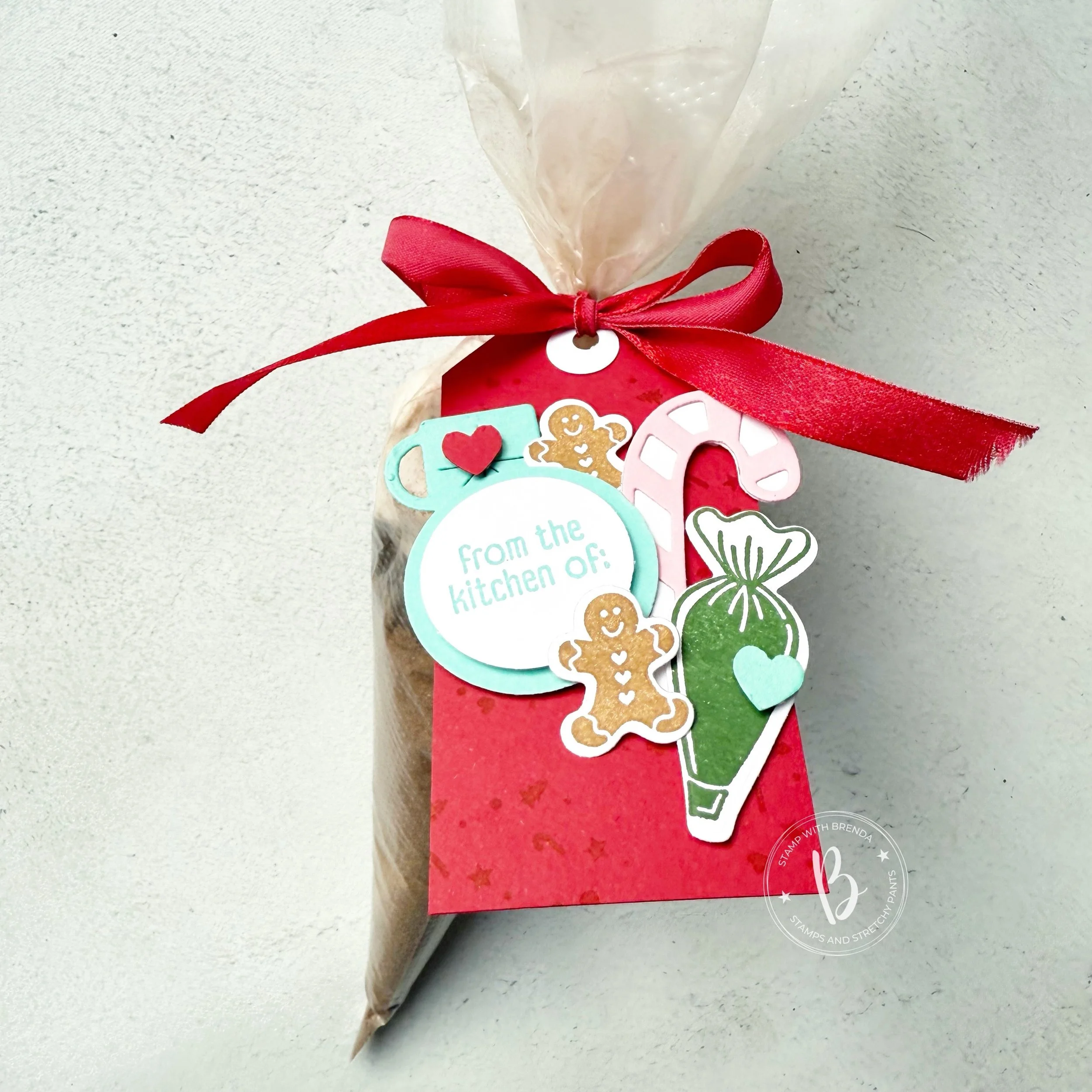 I made my own tag by cutting a piece of Coastal Cabana into 2 1/4 x 4 inches and stamped the squiggles along the bottom from the Gingerbread Man stamp set is the same color. I attached the tag through a piece of Real Red Shiny Ribbon. I cut the ribbon in half so that it wasn’t as thick. I tied into a knot on the cookie bag and left the tails of the ribbon to float free. The Garden Green & White Chevron ribbon was added over the hole on the tag to act as another bow. Sometimes I find this easier than trying to get my original ribbon to cooperate!