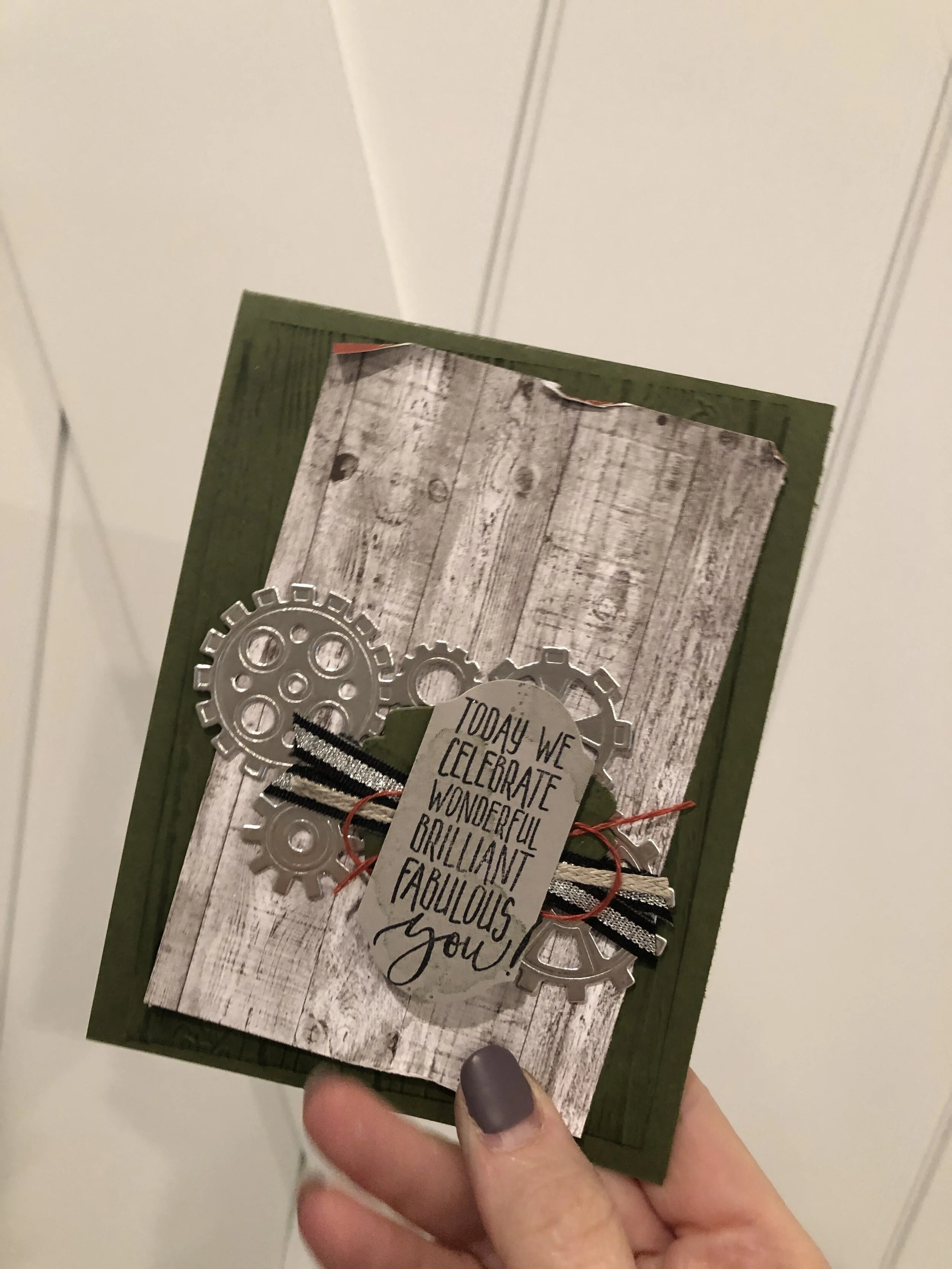 This class was a request from one of my customers! It is easy to get caught up in holiday crafting so I am offering a Best of Birthdays class to see you though the next few months! This class is $30 and we will make a total of 9 cards, 3 of 3 designs including this masculine one below! Please feel free to share with your friends! I hope you can join me for a night out!