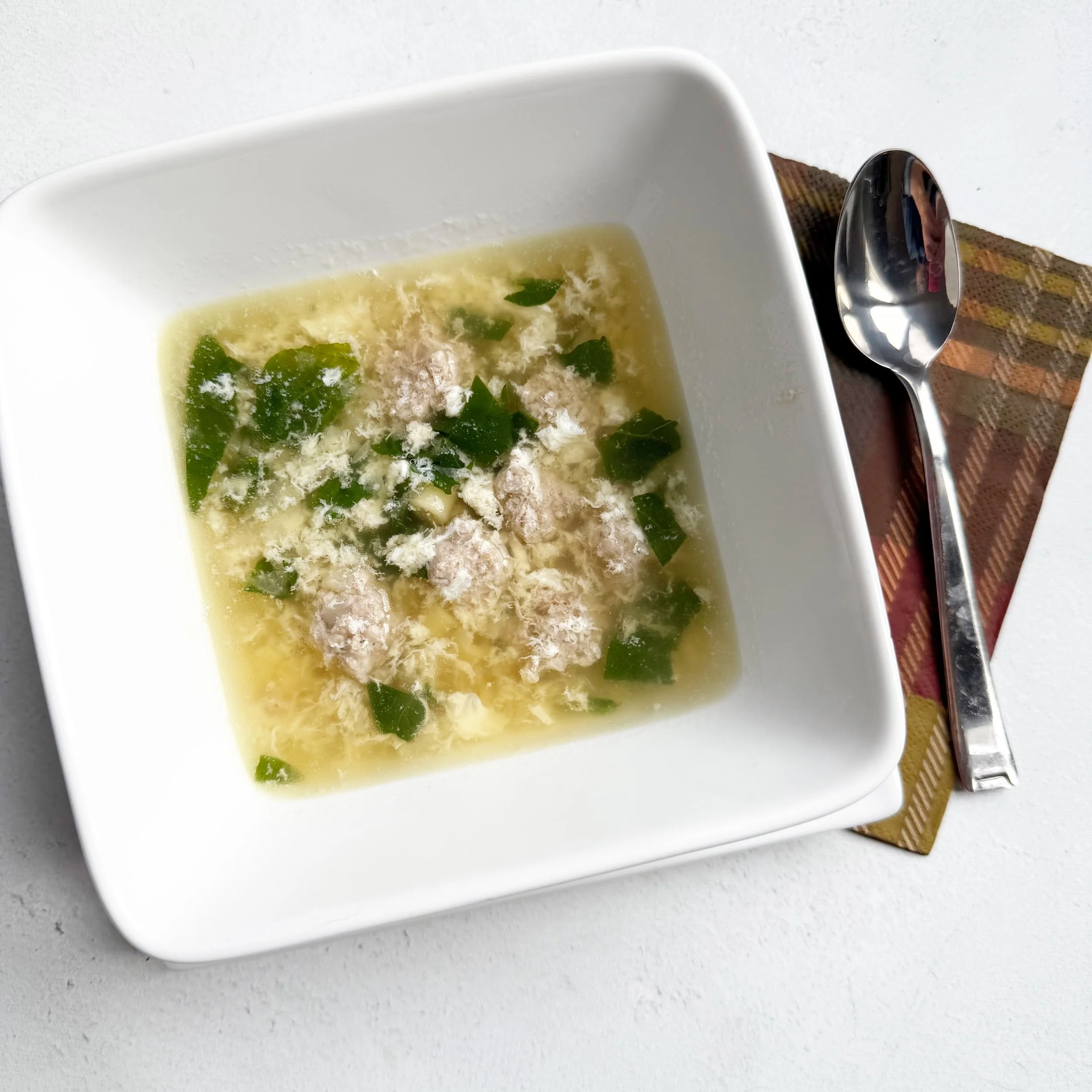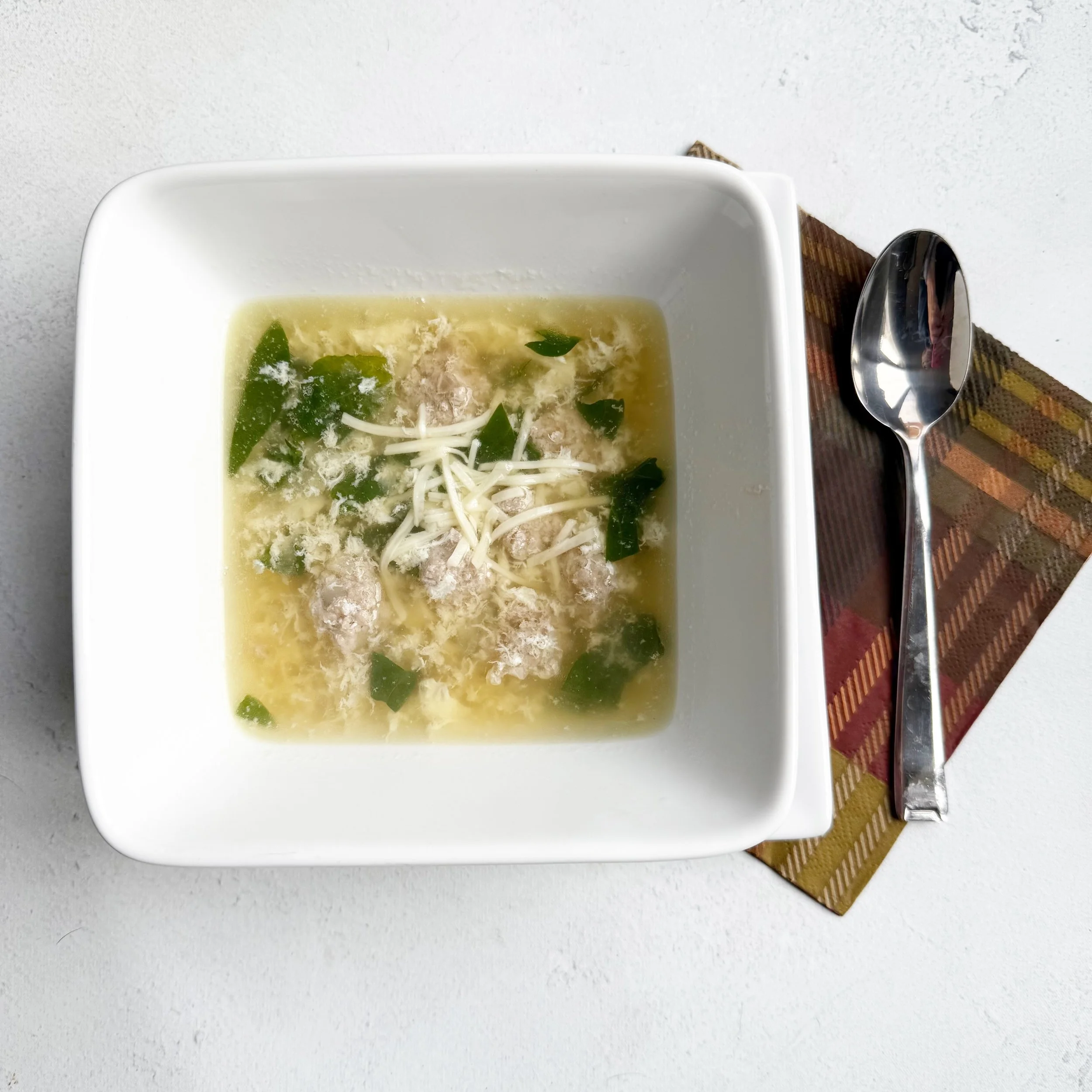 Bring the chicken stock to a boil with salt and pepper (second listed measurements). Add the meatballs and simmer until cooked— 8 min + (this time will depend on the size of your mini meatballs).